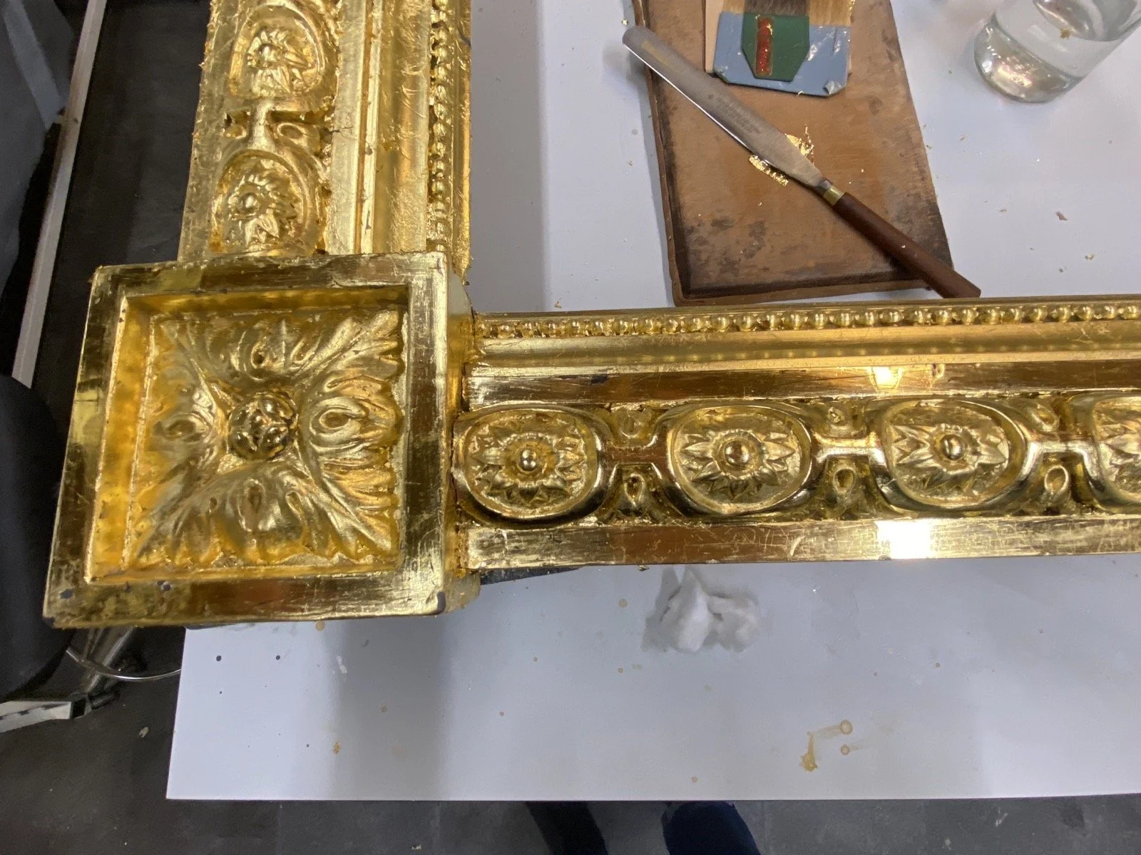 Der Spiegelrahmen mit Lorbeerkranz und Köcher mit Fackel war vermutlich ein Hochzeitsgeschenk Mitte bis Ende 18. Jh. Der Rahmen ist in einem relativ schlechten Zustand; die Verbindungen sind instabil, die Farbelemente und die Vergoldung wurden einst mit einer grauen Farbe überstrichen. Nach den konstruktiven Massnahmen wurde der Spiegelrahmen auf Wunsch des Kunden neu vergoldet, d.h. dem ursprünglichen Erscheinungsbild nachempfunden. Die Polimentvergoldung mit den unterschiedlichen Grundierungen haben wir in Zusammenarbeit mit der Vergolderin ausgeführt.